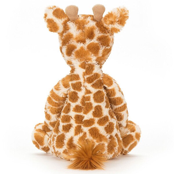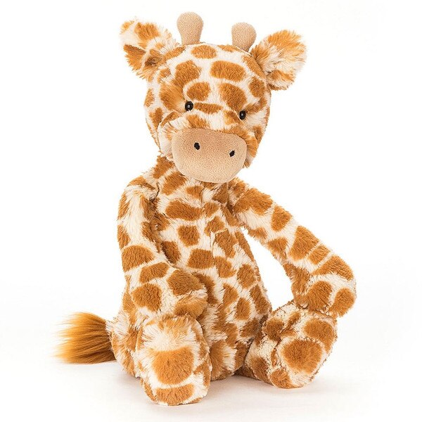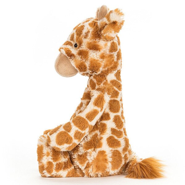 Bashful giraffe is floppy and cuddly, and ready for a buzzing adventure! Features brown and cream spotted fur, with floppy tail and nubby horns. Measures 12 inches tall.