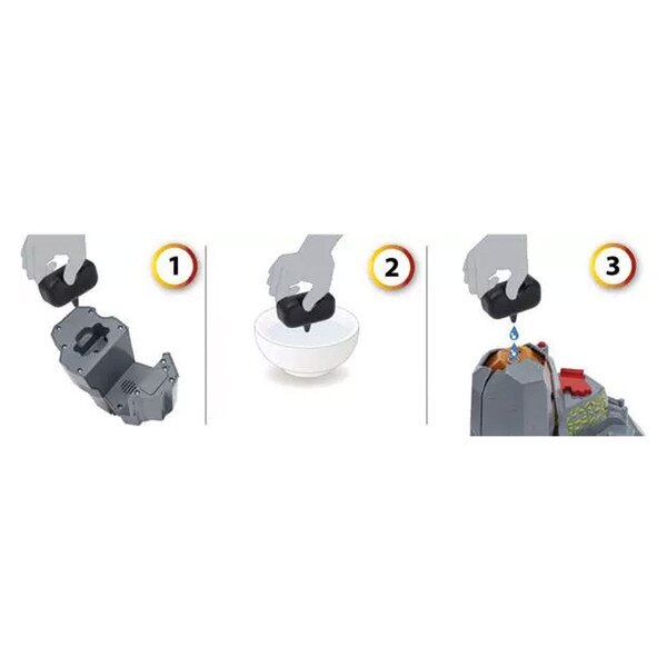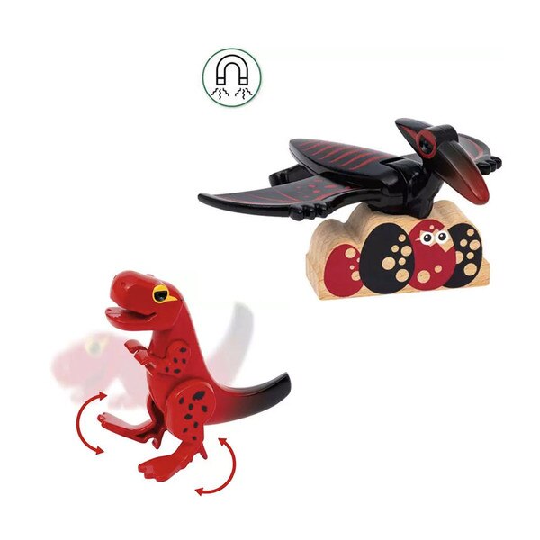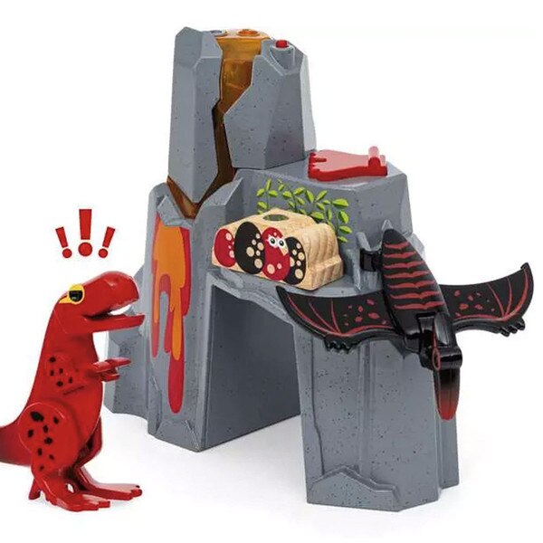 All aboard, for a train ride to prehistoric times! This Erupting Volcano is a fun way to add some Jurassic style to any wooden train layout. Press the button on the peak to activate lights, sounds and steam effect, culminating in an explosion that topples over the rock formations. T Rex and Pterodactyl figures included, plus wooden dino egg piece.
