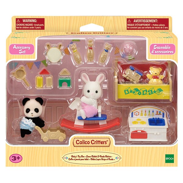 The Calico Critters Baby Toy Box set has everything you need for playtime with Snow Rabbit and Pookie Panda babies! Bench, pretend kitchen and rocking horse, plus additional accessories including building blocks, mini bowling set, push wagon and more!