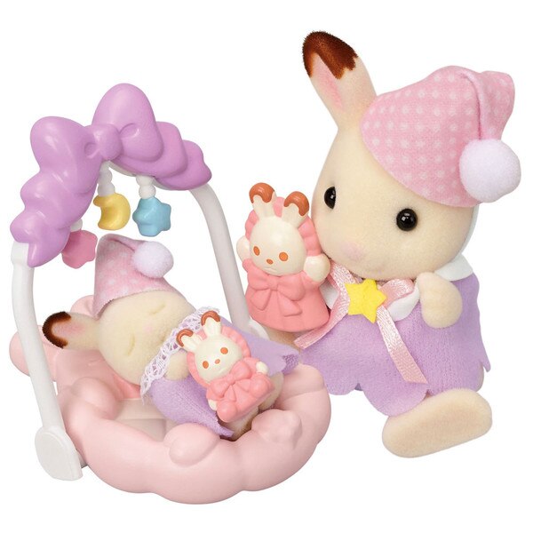 Bedtime can be fun! This set includes the Chocolate Rabbit girl and cradled baby with a baby gym and matching accessories. The adorable baby gym has a mobile to lull the cradled baby to sleep. The Chocolate Rabbit cradled baby has a special sleeping design with her eyes closed. The girl and cradled baby are wearing matching pajamas with night caps, and the puppet can be placed on the girl's hand.