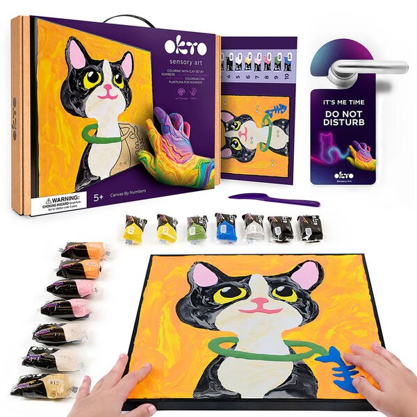 OKTO Clay by Numbers Kits are designed to stimulate young minds by offering a unique blend of sensory exploration, developing essential motor skills and hand-eye coordination, while promoting mindfulness and focus. With its residue-free formula, the clay does not leave traces on hands or hard surfaces. Each kit includes a numbered fiberboard base in a 11.4" x 11.4" frame, a bag with multiple packages of colored air clay and air paste, a wooden modeling instrument made of natural oak, a hanging "Do Not Disturb" door sign, a numbered guide and a QR code to a video tutorial to help create the project.