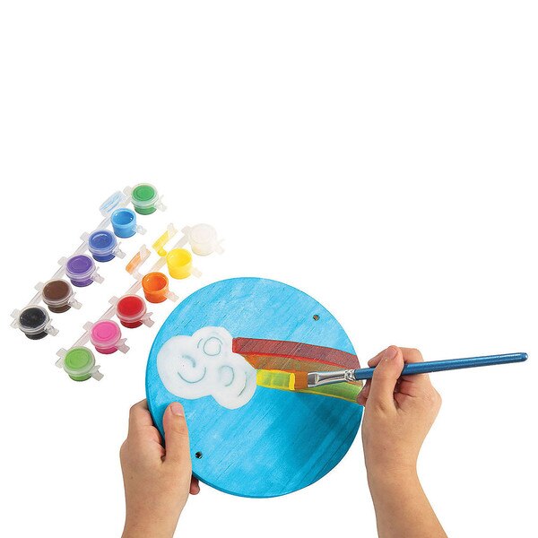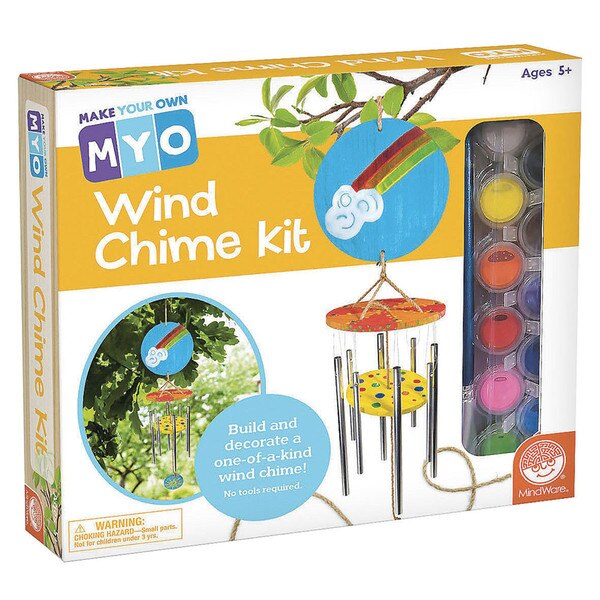 Let the wind create a peaceful song for your home! This Make Your Own Wind Chime Kit includes everything needed to build and decorate wind chimes. With pre-tied and snap-in components, assembly is easy and allows plenty of time for creativity - 12 paint colors provide an open-ended palette of inspiration for decorating the wood pieces. Once dry, hang indoors or out! Kit includes 4 wood discs, 8 metal chimes, twine, brads, paint, brushes, sponge, and instruction manual.