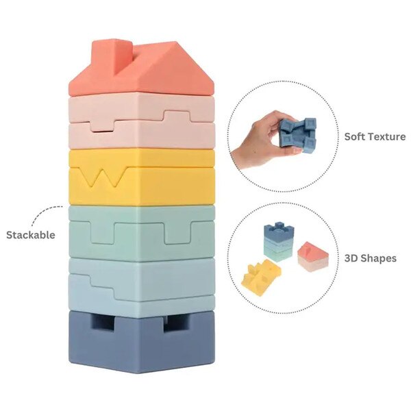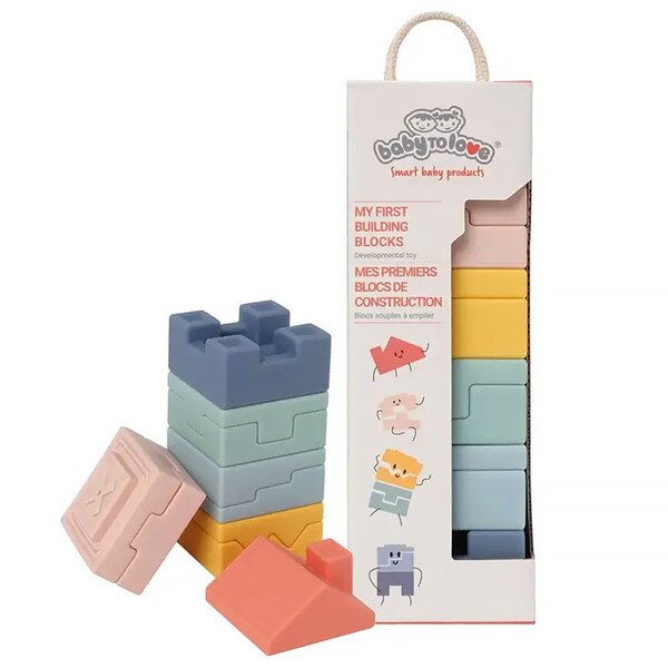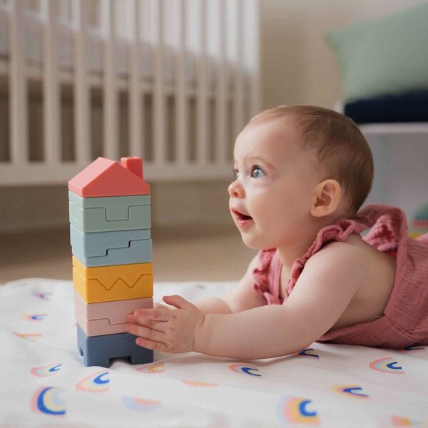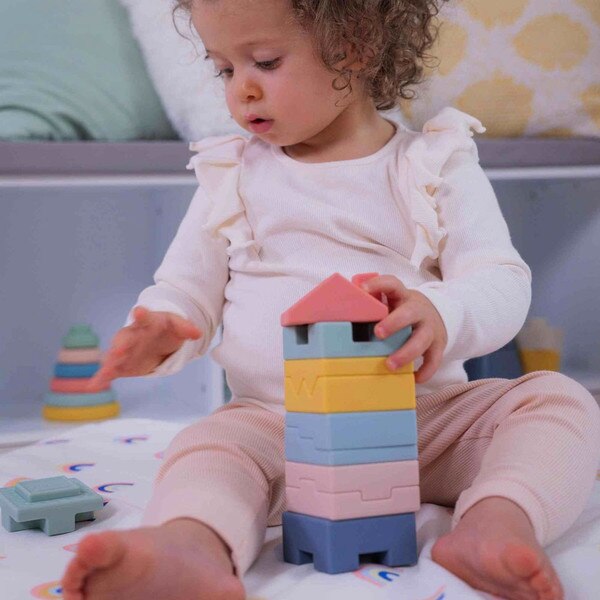 The ideal toy for babies, designed to awaken their curiosity and stimulate their creativity. This set of pastel-colored building blocks in different shapes is perfect for little hands and big play experiences. Easy to handle and soft to the touch, the blocks are specially designed to help develop fine motor skills and hand-eye coordination. They can be stacked on top of each other to form a tower or a house, offering endless play possibilities.