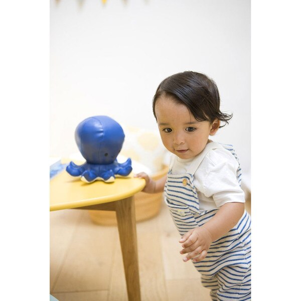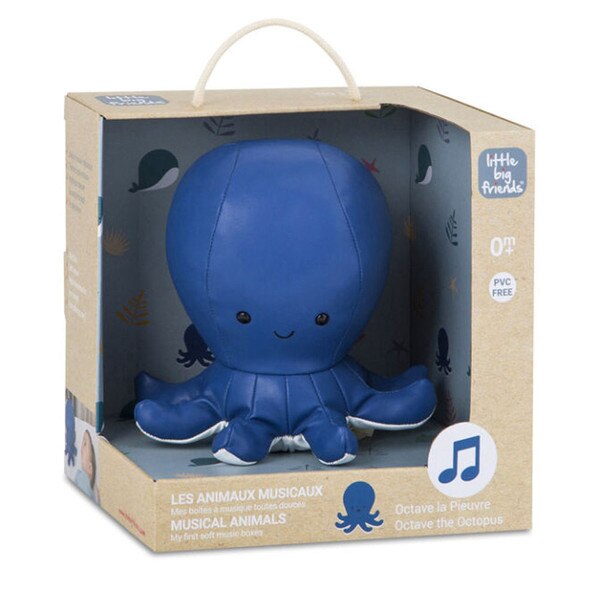 Little Big Friends are the most adorable nursery companions! Each Musical Friend is made from a soft coated polyester that has the smooth feel of leather, with firm polyester filling that has give when squeezed but is dense enough to stand on its own. Pulling on the matching toggled cord winds the music box and triggers a soothing melody, unique to each animal. Its rounded shape is made for a child's tactile satisfaction, and the color palette is sophisticated and ideal as bedroom decor. Octave the Octopus measures 7 inches high and plays "How Dry I Am".
