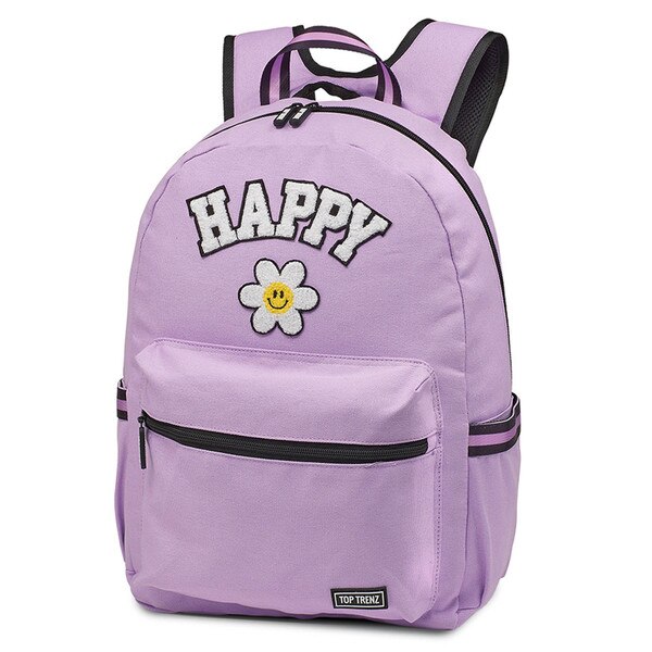 Back to school is now totally cool! This roomy 18-inch backpack features a daisy and HAPPY patches on durable purple canvas with a water-resistant nylon lining. An outside zippered pocket provides easy access to the necessities, side pocket holds water bottle or sunscreen, and large interior compartment can hold a day's worth of books and binders. The padded back panel and fully adjustable padded straps add comfort.