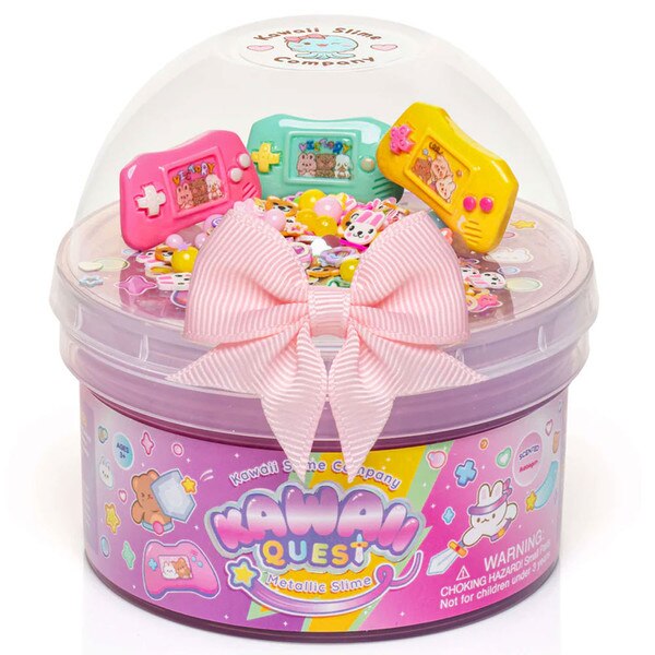 Game on! Join us on an epic adventure with Kawaii Quest Slime! This awesome mix of metallic pink and iridescent purple glitter clear slime smells just like bubblegum. Its thick, stretchy texture is perfect for poking, squishing, and popping bubbles as you play! Each slime comes with adorable gaming console charms and a playful mix of baubles, hearts, and character fimos. Get ready to level up the fun and dive into a world of squishy, sparkly, bubblegum-scented excitement!