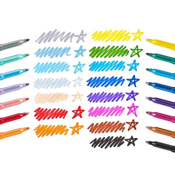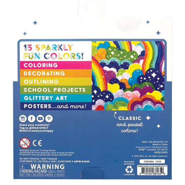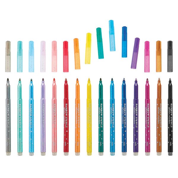 These markers are a glittery dream! Rainbow Sparkle markers have shimmery glitter-infused colors, 5 pastels and 10 classic shades, perfect for coloring and creating awesome art. Set includes 15 markers.