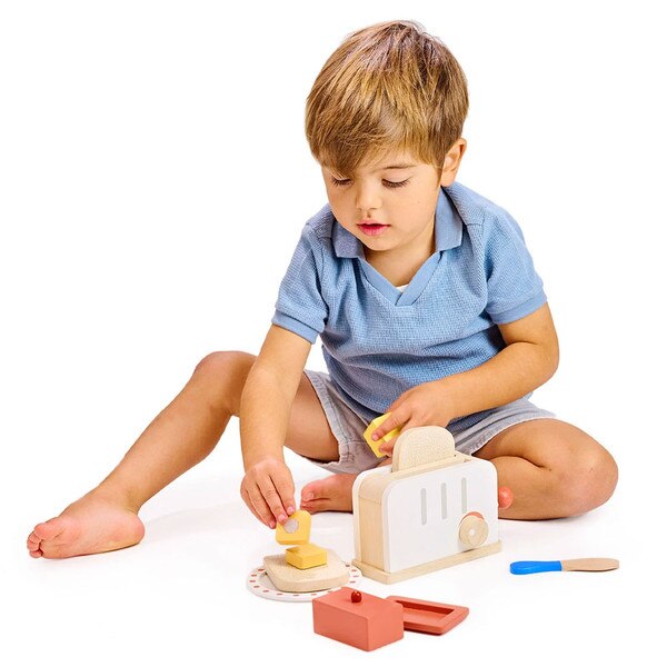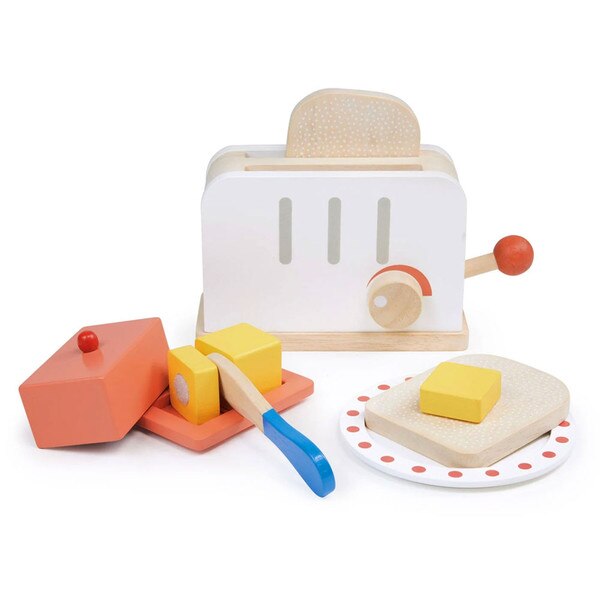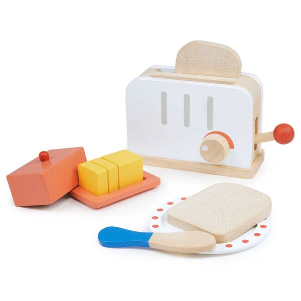 All the fun of making toast, just without all the messy crumbs! This wooden toy toaster includes a two slot toaster with push up mechanism, a dish with a lid of sliceable butter with velcro, a pretend knife, a plate and two slices of toast.