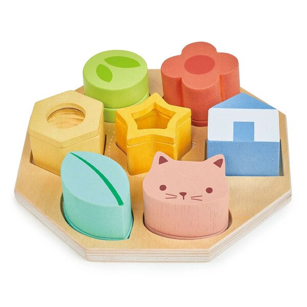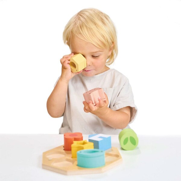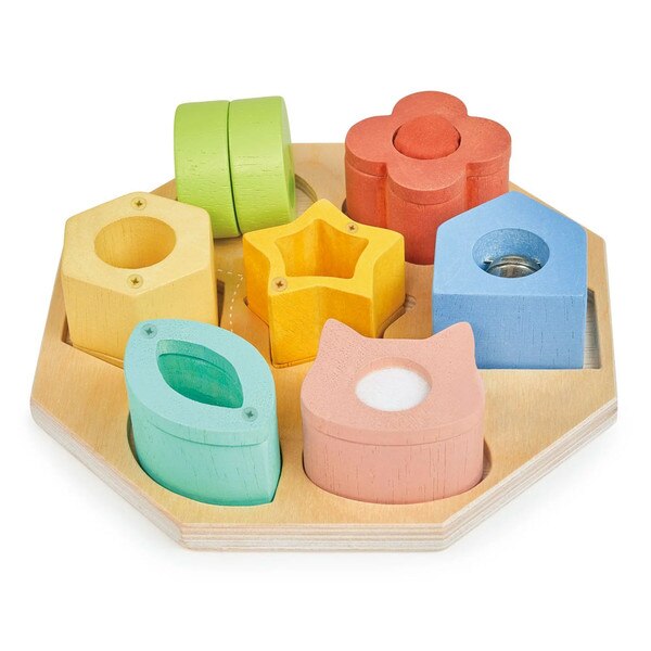 Part stacker, part puzzle, all fun! This sensory activity tray features a hexagonal wooden base and 7 sensory pieces that can be arranged and stacked atop the base, each with its own unique feature - prism, shaker, bead rattle, fur, and noisemaker.