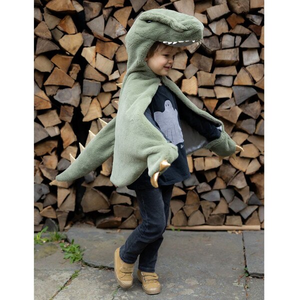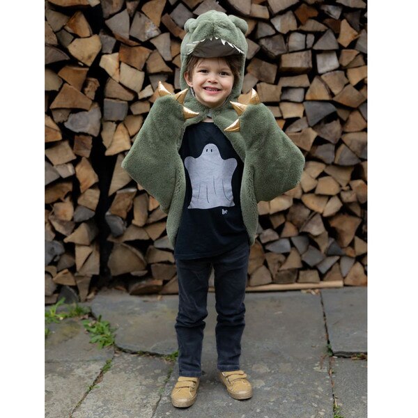Roar into adventures with this fantastic Green T-Rex Cuddle Cape a fierce and cozy cape that brings dino dreams to life! Crafted from ultra-soft forest green fur, this bold cape transforms your little one into a mighty T-Rex! The plush, stuffed hood is shaped like a dinosaur head with realistic eyes and complete with white felt teeth and gleaming gold metallic claws for that extra prehistoric flair. The tail is reinforced for structure and features gold spikes. Perfect for both snuggles and stomping around, this cape features a Velcro neck closure for easy wear and pocketed “dino paws” to keep little hands warm while they play, roar, and rule their Jurassic kingdom! Just like all Great Pretenders, this cape is Machine Washable!