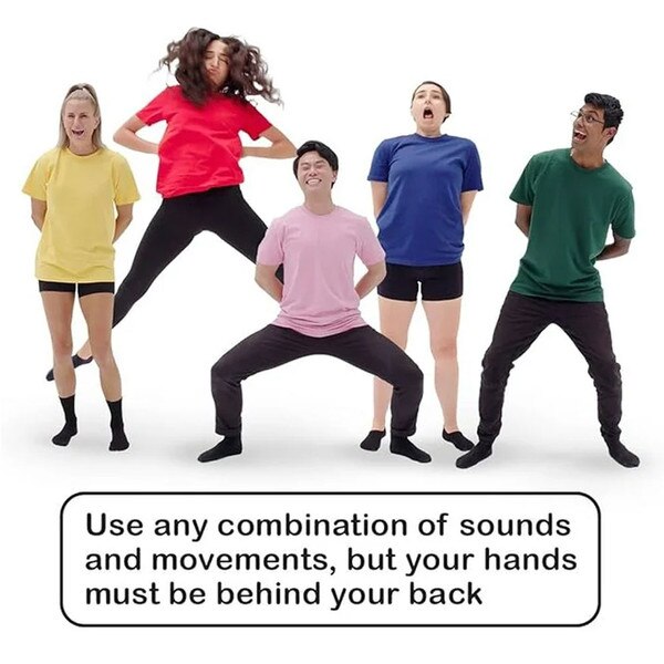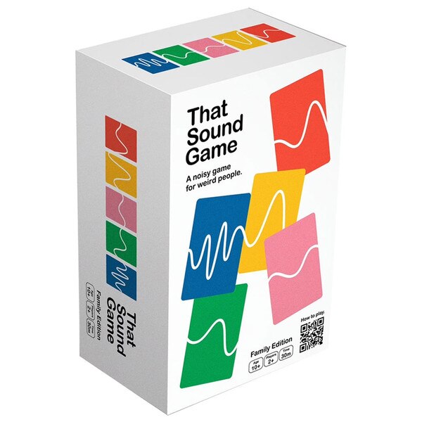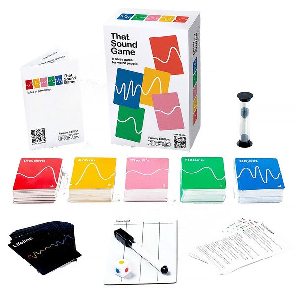 That Sound Game is a fast-paced, interactive and very noisy party game.The goal is to get your team to guess as many answers on the category cards as they can in a minute. Use any combination of sounds and movements, but your hands must be behind your back! You also get Lifelines, but you must use them strategically to help you win.