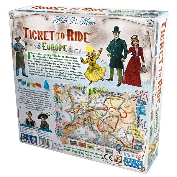 Ticket to Ride: Europe takes you on a new train adventure across Europe. From Edinburgh to Constantinople and from Lisbon to Moscow, you'll visit great cities of turn-of-the-century Europe. Like the original Ticket to Ride, the game remains elegantly simple, can be learned in 5 minutes, and appeals to both families and experienced gamers.