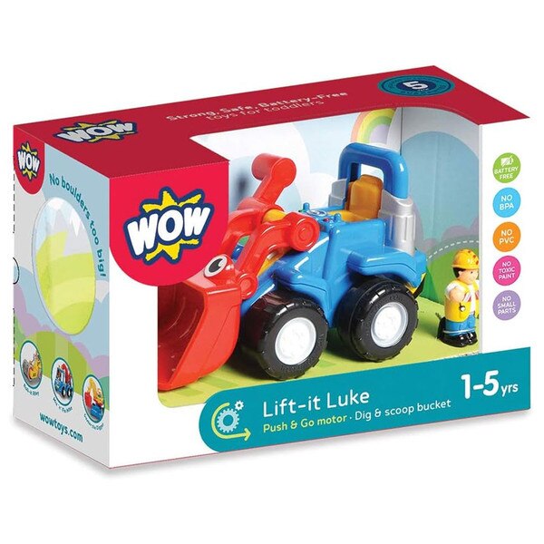 Lift-it Luke Digger is the super strong and lightweight digger ready for any construction task. Pull his handle to lift his bucket and push him along to transport him around the building site. This tractor's front loader even has eyes to see what to dig up! Featuring a push & go motor with realistic engine sounds, this tough but mighty little guy has an easy-to-use lifting front bucket with arm that locks into upright position to hold whatever materials you can imagine for playtime! And it comes with a removable construction driver as well.